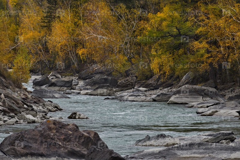 Россия. Юг Западной Сибири, горный Алтай. Живописные берега реки Чуя близ села Акташ, окрашенные поздней осенью в желтокаменный цвет