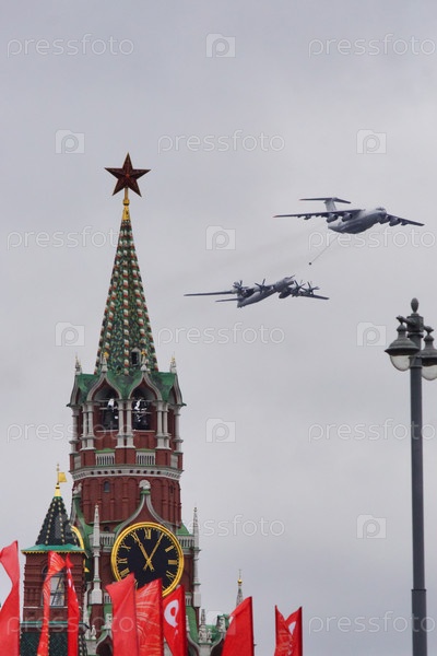 Репетиция воздушной части парада Победы в Москве 9.05.2021, военные самолеты пролетают над Спасской башней Кремля