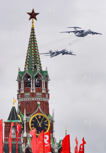 Репетиция воздушной части парада Победы в Москве 9.05.2021, военные самолеты пролетают над Спасской башней Кремля
