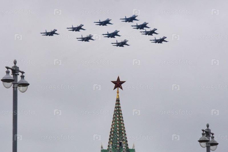 Репетиция воздушной части парада Победы в Москве 9.05.2021, военные самолеты пролетают над Спасской башней Кремля