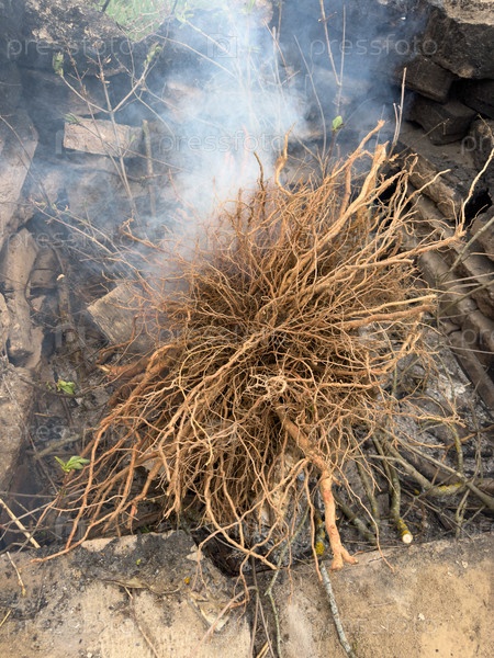 Ветки корней деревьев лежат в огне