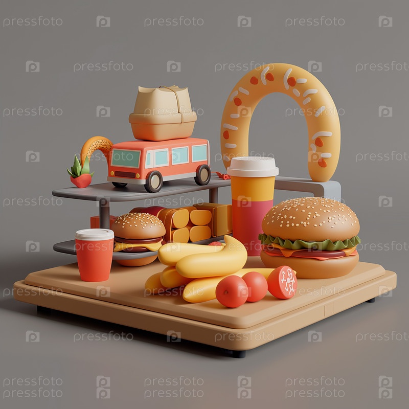 3D изометрическая иллюстрация. Концепция фаст-фуда. Напитки, чизбургеры, доставка
