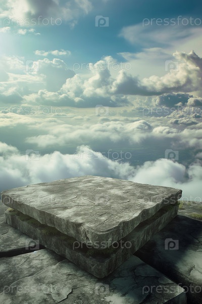 Каменный подиум для демонстрации продукции в окружении облаков и неба. Фон для брендинга, идентичности и упаковки косметической продукции. Фон дизайна макета размещения продукта