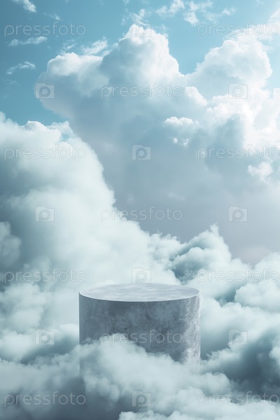 Каменный подиум для демонстрации продукции в окружении облаков и неба. Фон для брендинга, идентичности и упаковки косметической продукции. Фон дизайна макета размещения продукта