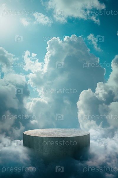 Каменный подиум для демонстрации продукции в окружении облаков и неба. Фон для брендинга, идентичности и упаковки косметической продукции. Фон дизайна макета размещения продукта