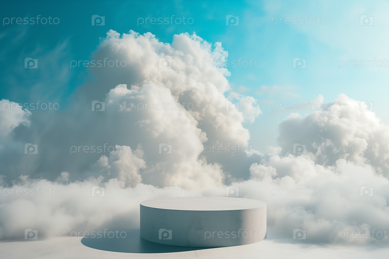 Каменный подиум для демонстрации продукции в окружении облаков и неба. Фон для брендинга, идентичности и упаковки косметической продукции. Фон дизайна макета размещения продукта