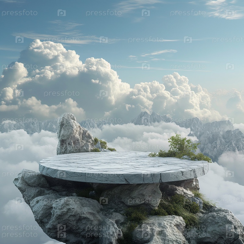 Каменный подиум для демонстрации продукции в окружении облаков и неба. Фон для брендинга, идентичности и упаковки косметической продукции. Фон дизайна макета размещения продукта