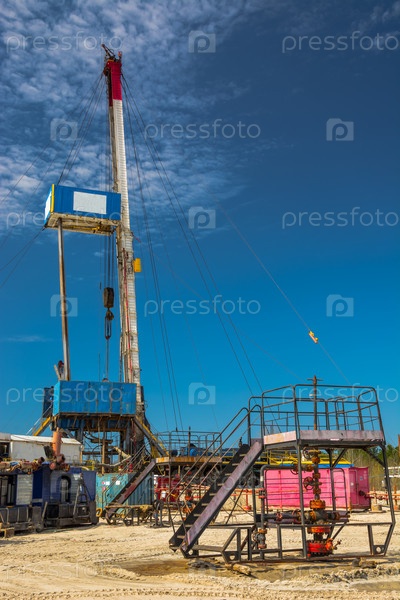 Мобильная буровая установка для бурения нефтяных и газовых скважин. На фоне голубого неба. Арматура для добычи нефти и газа расположена рядом с буровой