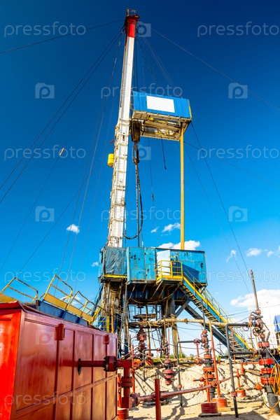 Мобильная буровая установка для бурения нефтяных и газовых скважин. На фоне голубого неба. Арматура для добычи нефти и газа расположена рядом с буровой