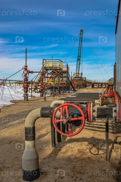 Нефтяное месторождение в Сибири. В ряд идут нефтедобывающие скважины. На заднем плане ведутся работы по капитальному ремонту скважины. На переднем плане коллектор с клапанами