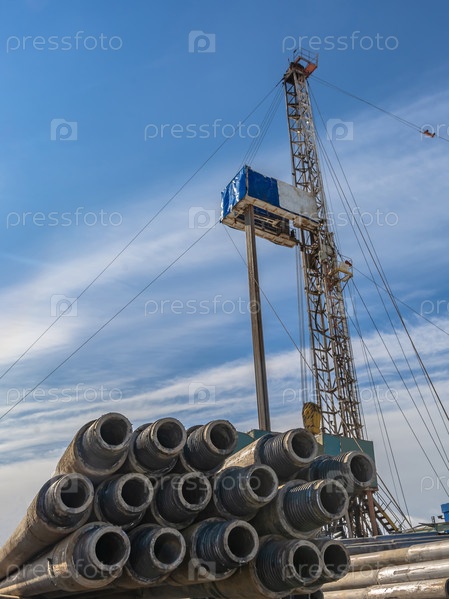 Бурильные трубы на переднем плане. На заднем плане — мобильная буровая установка для бурения нефтяных и газовых скважин. Фон - голубое небо с облаками