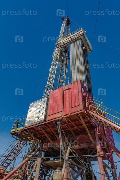 Конструкция буровой установки для глубокого бурения нефти и газа на фоне голубого неба. Многие бурильные трубы установлены вертикально