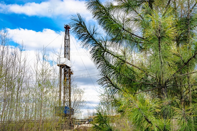Буровая установка для нефти и газа на заднем плане в фокусе. На переднем плане молодые деревья весной не в фокусе. Весенняя природа Сибири. Солнечный день