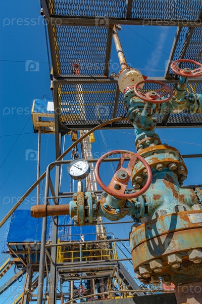 Фонтанная арматура нефтяных скважин. Трубопроводы и оборудование высокого давления. Сквозь решетчатый пол сервисной платформы на заднем плане видна буровая установка