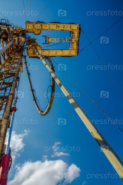 Бурение скважины для добычи нефти и газа на месторождении. Вышка, оборудование и инструменты для бурения скважин. Труба вращается и уходит в скважину