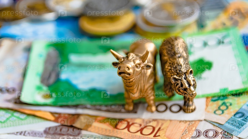 Бронзовые фигурки быка и медведя на фоне бумажных денег и металлических монет. Размытие фона и перспективы. Концепция и символ фондовой биржи и торговли акциями