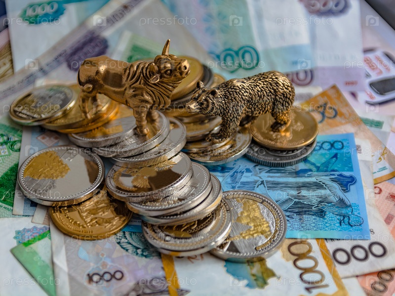 Бронзовые фигурки быка и медведя украшены бумажными и металлическими монетами. Размытие фона. Символ и концепция торговли на фондовой бирже