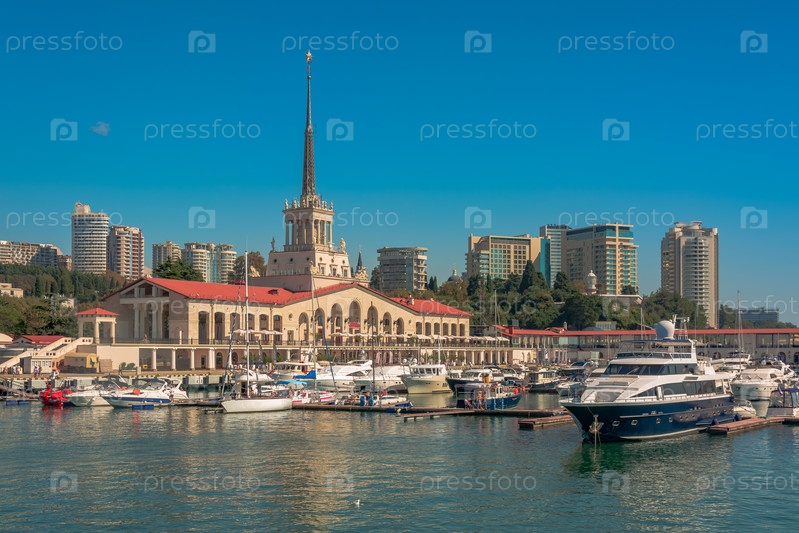 Морской порт летом. На пристани стоит множество разных яхт и катеров. Яхтсмены и путешественники готовятся к выходу в море. На фоне здания приморского города