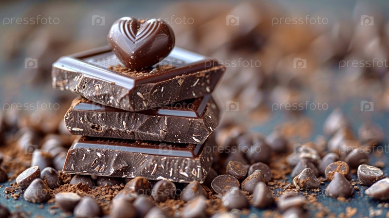 На сером столе лежат шоколадные конфеты, на которых кусочки шоколада сложены друг на друга, а на самом верху шоколадное сердце, Всемирный день шоколада
