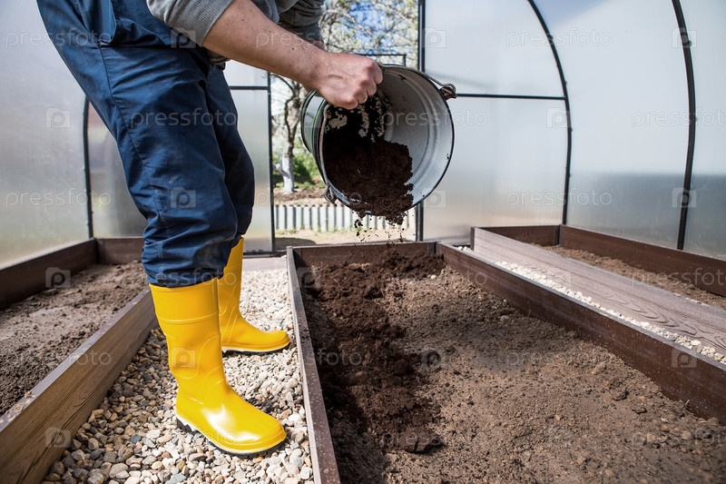 Фермер наливает новую почву, почву для новой теплицы. Концепция весенней посадки овощей и земледелия