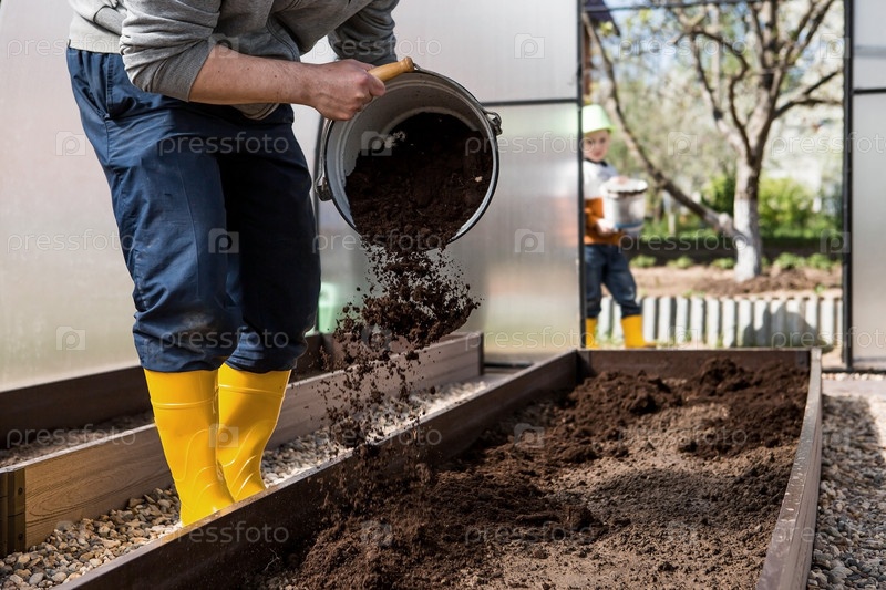 Фермер наливает новую почву, почву для новой теплицы. Концепция весенней посадки овощей и земледелия