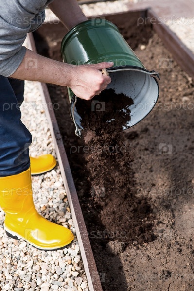 Фермер наливает новую почву, почву для новой теплицы. Концепция весенней посадки овощей и земледелия