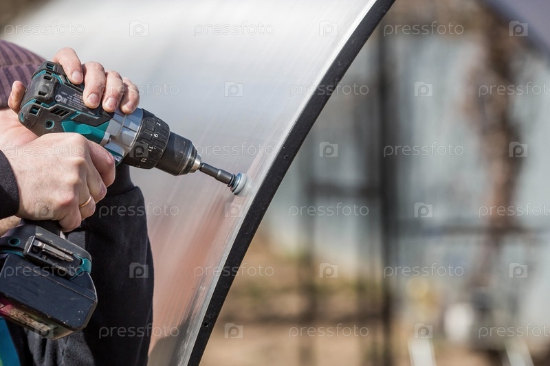 Мужчина держит отвертку на аккумуляторе и собирает новую теплицу из полиэтилена и поликарбоната. Макрофотография. Вид сбоку. Подготовка к весеннему садовому сезону