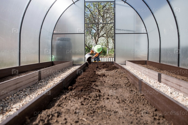 Фермер наливает новую почву, почву для новой теплицы. Концепция весенней посадки овощей и земледелия