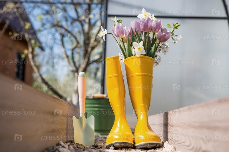 Желтые резиновые сапоги с букетом весенних тюльпанов и нарциссов. Ведро и маленькая лопатка в новой теплице. Концепция весенней посадки овощей и сельского хозяйства