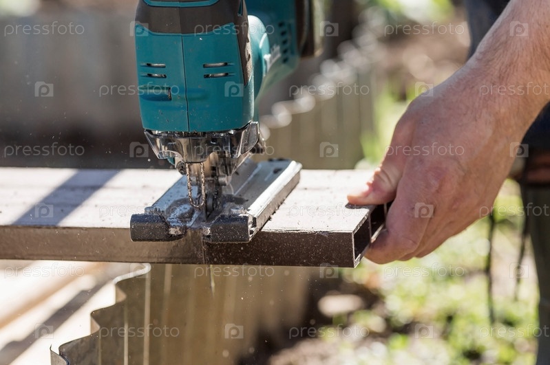 Мужчина держит электропилу на аккумуляторе и строит новые грядки в теплице из древесно-полимерного композита. Макрофотография. Вид сбоку. Подготовка к весеннему садовому сезону