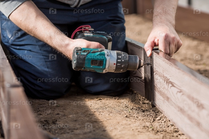 Мужчина держит аккумуляторную отвертку и собирает новые грядки из ДПК в теплицу из полиэтилена, поликарбоната. Макрофотография. Вид сбоку. Подготовка к весеннему садовому сезону
