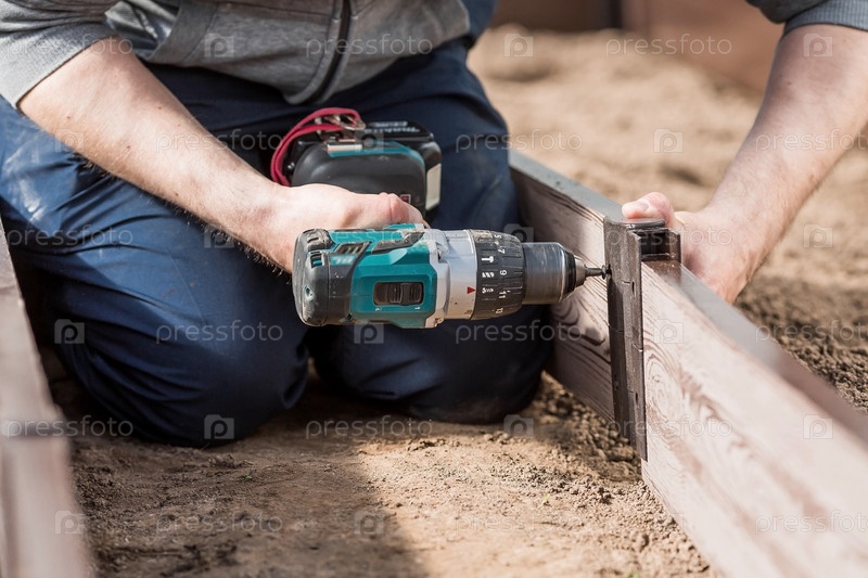Мужчина держит аккумуляторную отвертку и собирает новые грядки из ДПК в теплицу из полиэтилена, поликарбоната. Макрофотография. Вид сбоку. Подготовка к весеннему садовому сезону