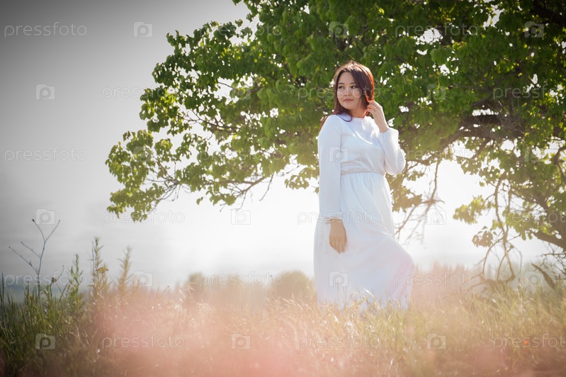 Азиатская девушка в цветочном поле в белом платье на природе на фоне гор