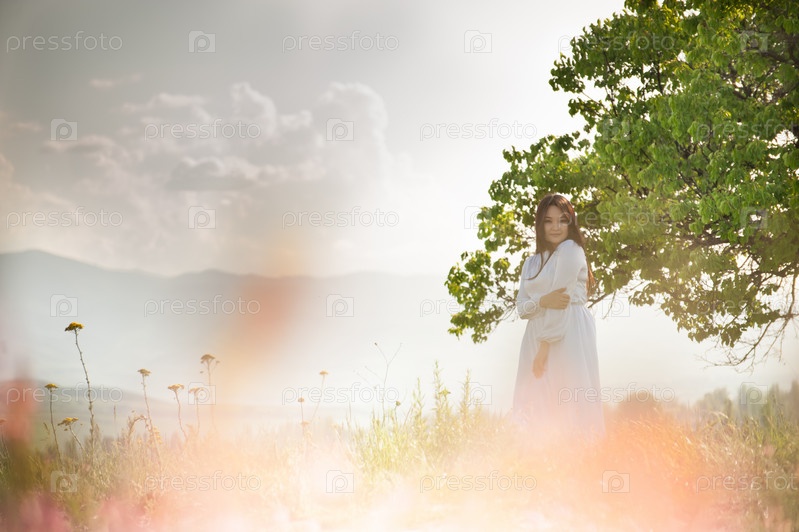 Азиатская девушка в цветочном поле в белом платье на природе на фоне гор