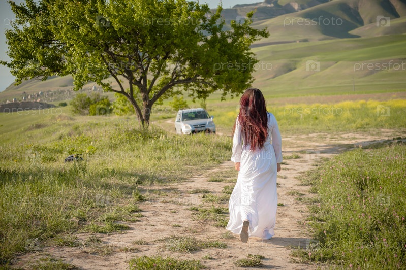 Девушка бежит по полю в белом платье