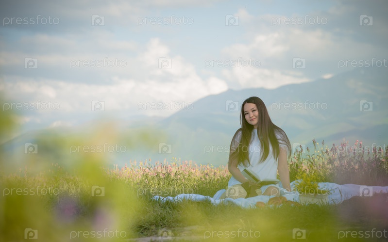 Девушка 20-25 лет весной и летом сидит в поле на природе на пикнике в шляпе и белом платье, ест фрукты и читает книгу