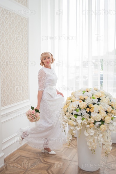 НЕВЕСТА в белом платье и с букетом цветов