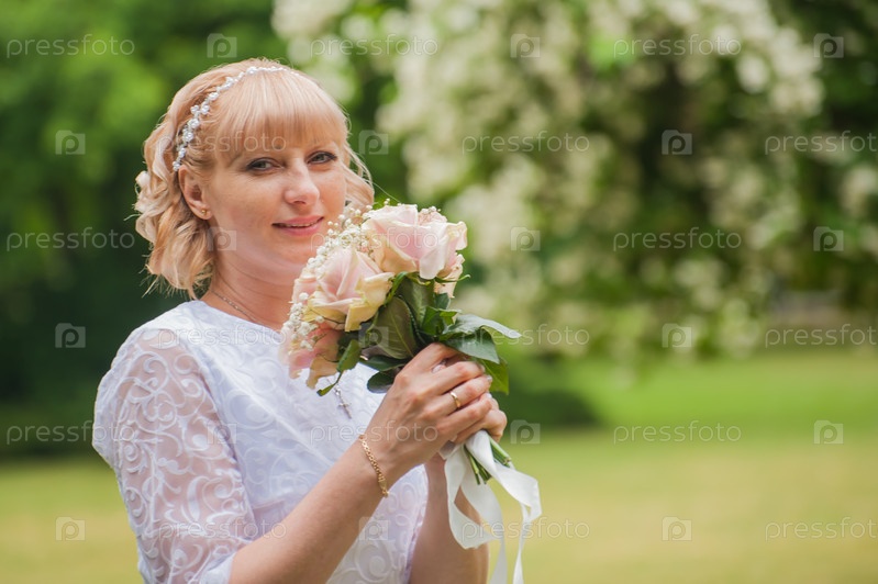 НЕВЕСТА в белом платье и с букетом цветов