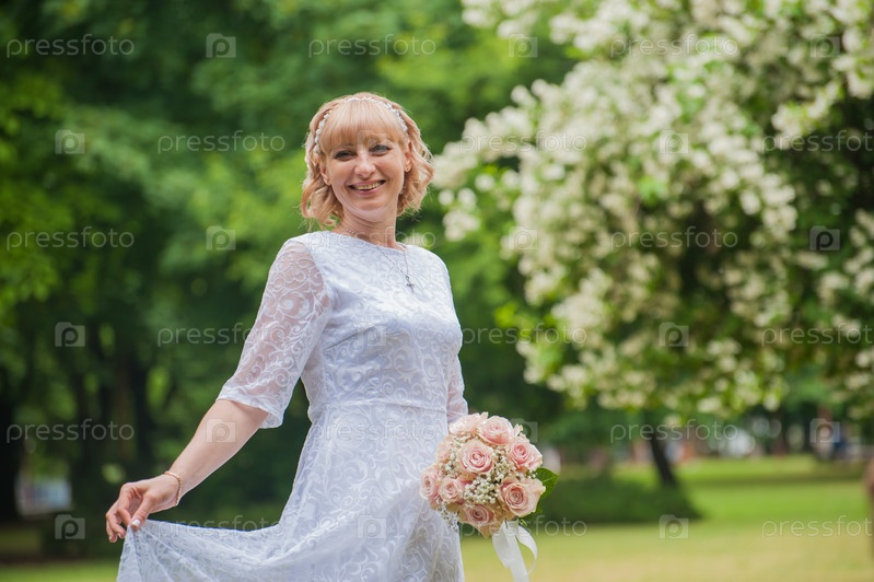 НЕВЕСТА в белом платье и с букетом цветов