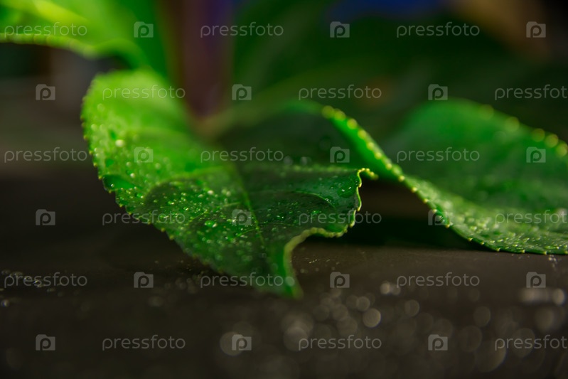 Лист аралии с каплями воды крупным планом