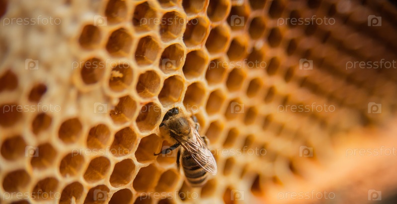 Рамка с пчелами и медом, сотовые ячейки крупным планом