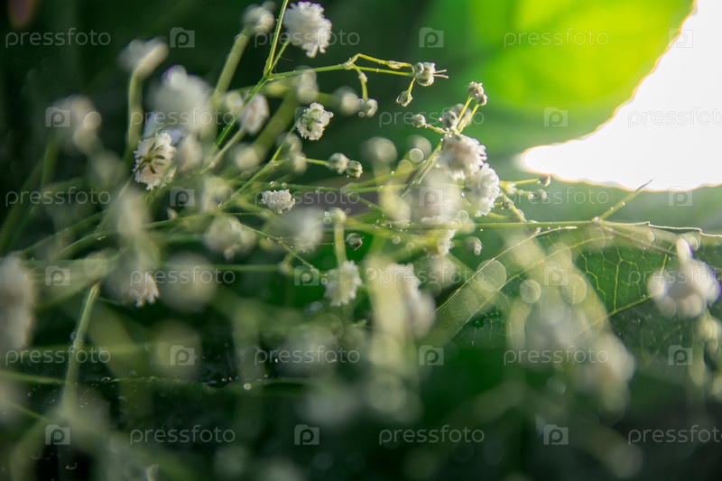 Цветочная композиция из гипсофиловых огней и листьев Аралии