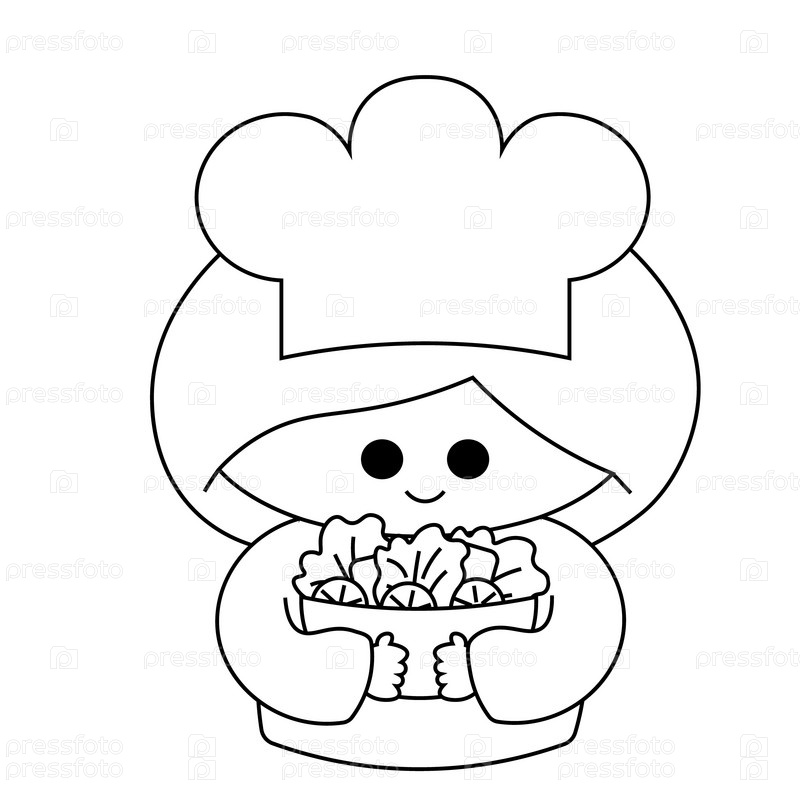 Милая мультяшная девочка с салатом в черно-белом цвете