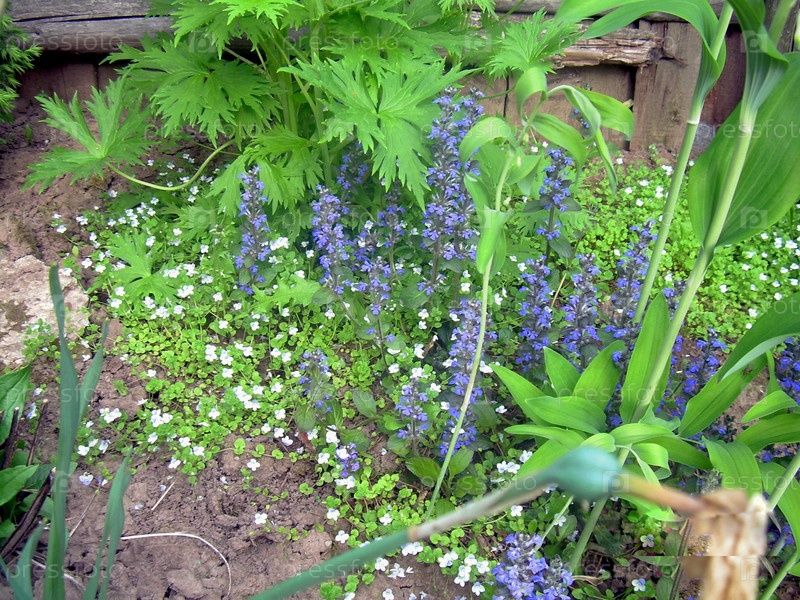 Оформление, озеленение садового участка, живучка ползучая, вероника нитчатая