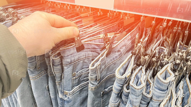 Мужчина выбирает джинсы в магазине, Тонированное изображение, Выборочный фокус