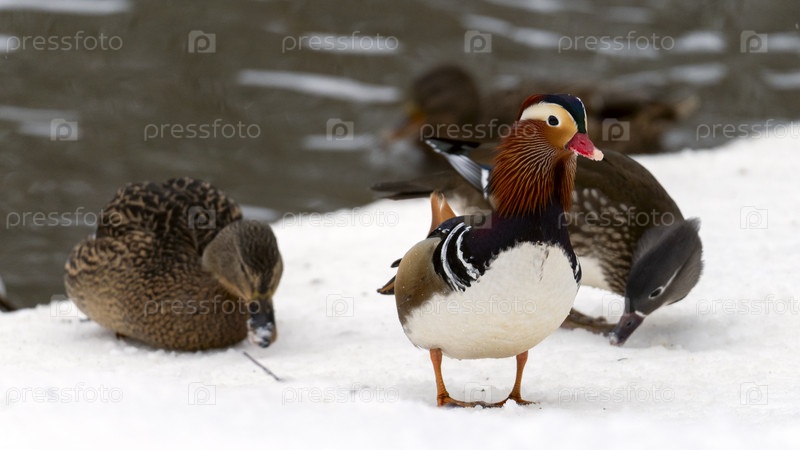 Утка-мандаринка зимой, Утки в снегу крупным планом