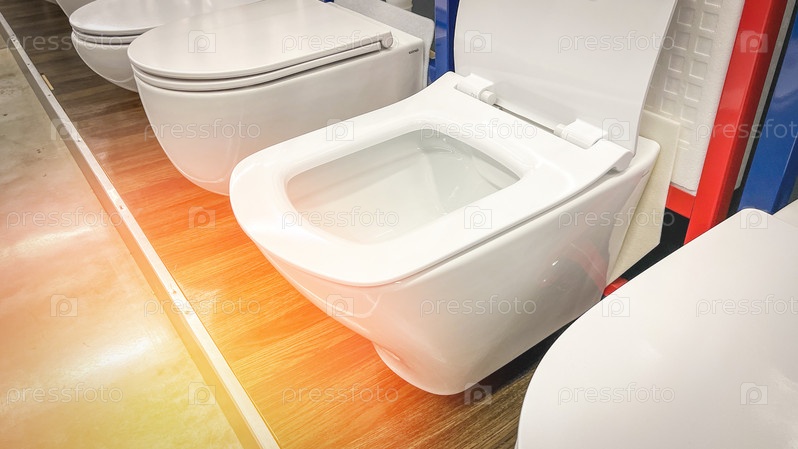Унитаз крупным планом в магазине сантехники, Селективный фокус, Новая сантехника для туалета