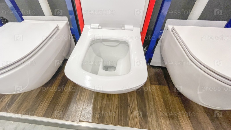 Унитаз крупным планом в магазине сантехники, Селективный фокус, Новая сантехника для туалета