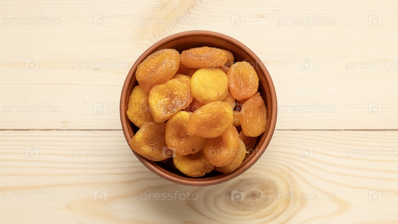 Деревянный стол с сухофруктами. Курага в глиняной чашке на деревянном фоне, вид сверху, крупный план