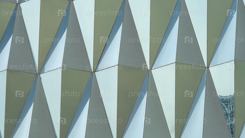 Современное стекло офисного здания. Архитектурная деталь в зеленых тонах. Треугольный фасад здания из зеленого стекла, стеклянный фасад современного здания. Абстракция